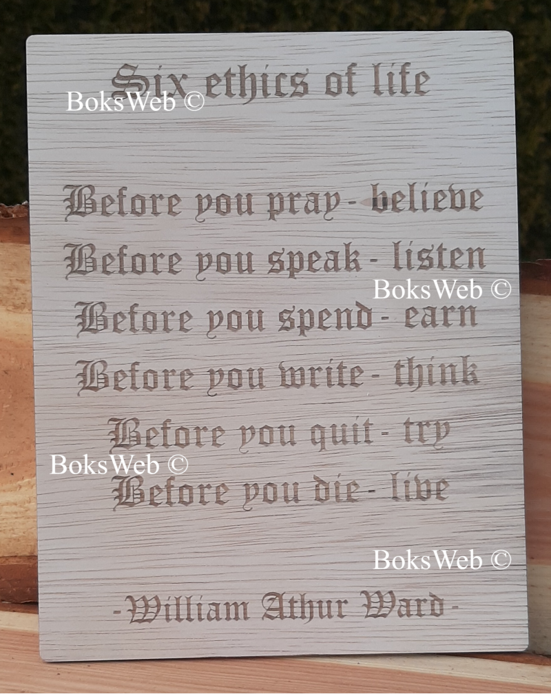 *Voorbeeld aan de rechterzijde "Six ethics of life" kost €10,- incl. Btw en is 18cm x 23cm.